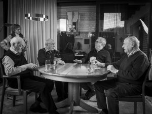 „Ach, Karten spielen können wir auch!“ war die erste Reaktion der Damen. Wir, damit meine ich Marlies, Petra, Thea und mich, sitzen bei Marlies am Küchentisch und überlegen, wie wir die drei ein bisschen in Action fotografieren können. Schild 20 soll das Küchenteam des katholischen Ferienhilfswerkes zeigen und gerne möchten wir irgend etwas dynamisches in Szene setzen. Zum Zeitpunkt der geplanten Aufnahme lagen Ferien und Ferienlager noch in weiter Ferne, gerne hätte ich das Team zum Fotografieren in die spanische Sonne begleitet, Kochen oder nicht! 😀 So aber erzählte ich ein bisschen, was ich bereits im Kasten hatte und erzählte von der Umsetzung mit der Ü80-Doppelkopfrunde.