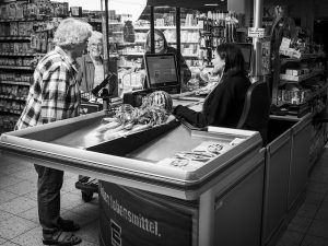 Es waren ein paar Tage Zeit bis zum Shooting, ich überlegte, dass wir das Hinausschieben der Einkaufswagen ja schon vor den Kassen oder im Ausgangsbereich fotografieren könnten oder, die Idee kam mir später, was ich noch besser fände, eine Kassenszene.