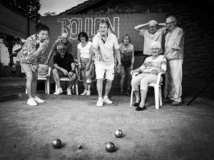 Ihr werdet es bereits geahnt haben, das Schild enthüllt das Rätsel um den letzten Teil des Titels dieses Blogs, das „Schweinchen“ (franz. Cochonnet) ist die Zielkugel, die als erstes geworfen wird und hier für den Bildaufbau natürlich viel zu nah am Werfer liegt. 😉 Auch wenn die Stühle normalerweise nix auf dem Platz zu suchen haben und die nicht aktiven Spieler sonst auch auf der Seite stehen, wollte ich auch eine gewisse Gemütlichkeit dieser Sportart unterstreichen, an diesem Tag noch ein wenig unterstützt durch die Darreichung einer Jubiläumsgetränkerunde.